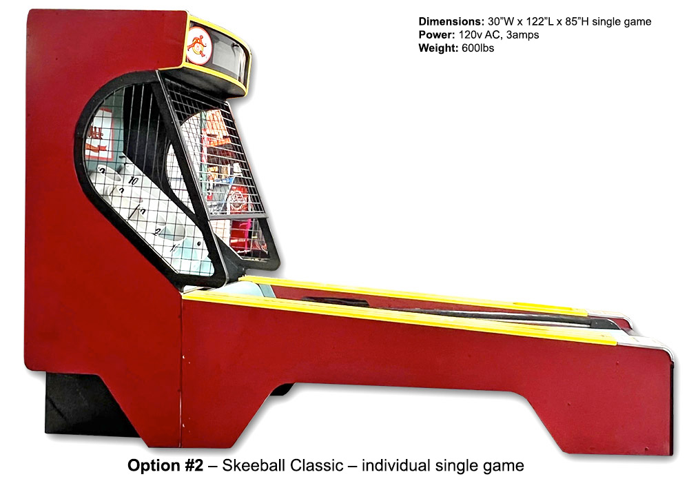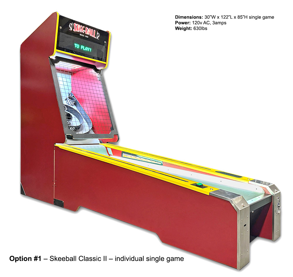 We offer for rent the new (Option #1) Skee-Ball Classic II and the original (Option #2) Skee-Ball Classic alley games. Skee-Ball Classic II features modern updates to the cabinet, ball dispensing mechanism, and electronics. Both Skee-Ball Classic lanes preserve the nostalgic look and feel of the original patented design, complete with the elaborate details and craftsmanship typical of the era. The game maintains the traditional front and side metal cages, the classic sounds, and the straightforward point-scoring system that true Skee-Ball purists will appreciate.